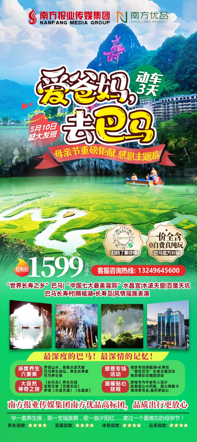 与此同时,“爱爸妈 去巴马”4天3晚主题旅游线路成为咨询热点。该线路涵盖巴马命河、百魔洞、水晶宫、赐福湖长寿岛等核心景点,融合生态观光、康养体验与孝亲文化,专为中老年群体设计。“带父母去巴马,不仅是旅行,更是一次康养体验和亲情陪伴。”现场不少子女为父母详细咨询行程安排,计划在母亲节期间开启一场“孝心之旅”。